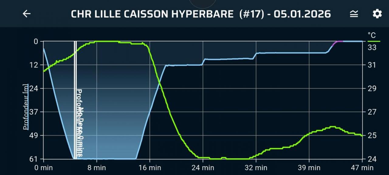 Une plongée à une pression équivalente à 61m de profondeur ! Temps total : 45 min, 10 min de temps fond et une déco à l'O₂.